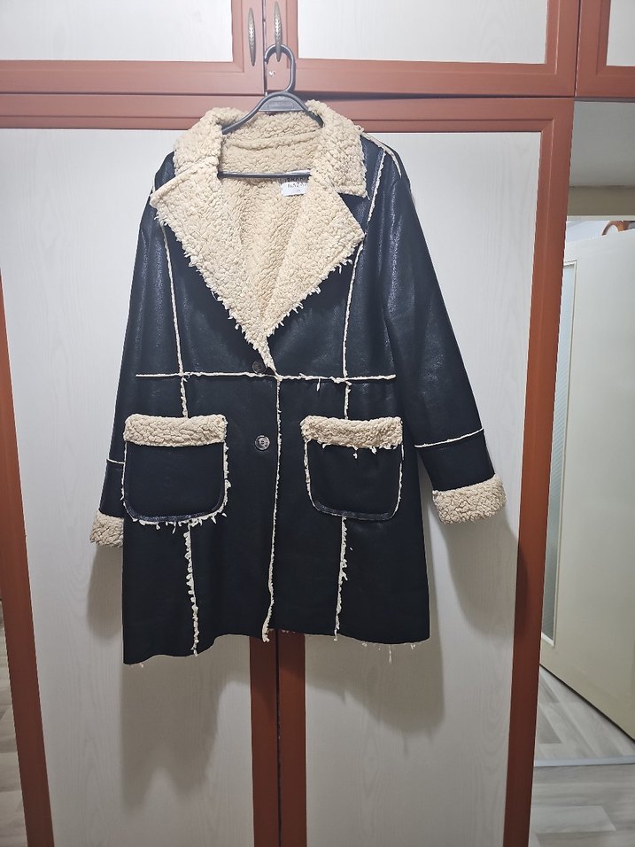 #Deri #mont #kürk için kürklü,suni deri 46 beden kaban boyu 90 cm, omuzdan kol 59 cm, düğmeli şekilde eni 65 cm