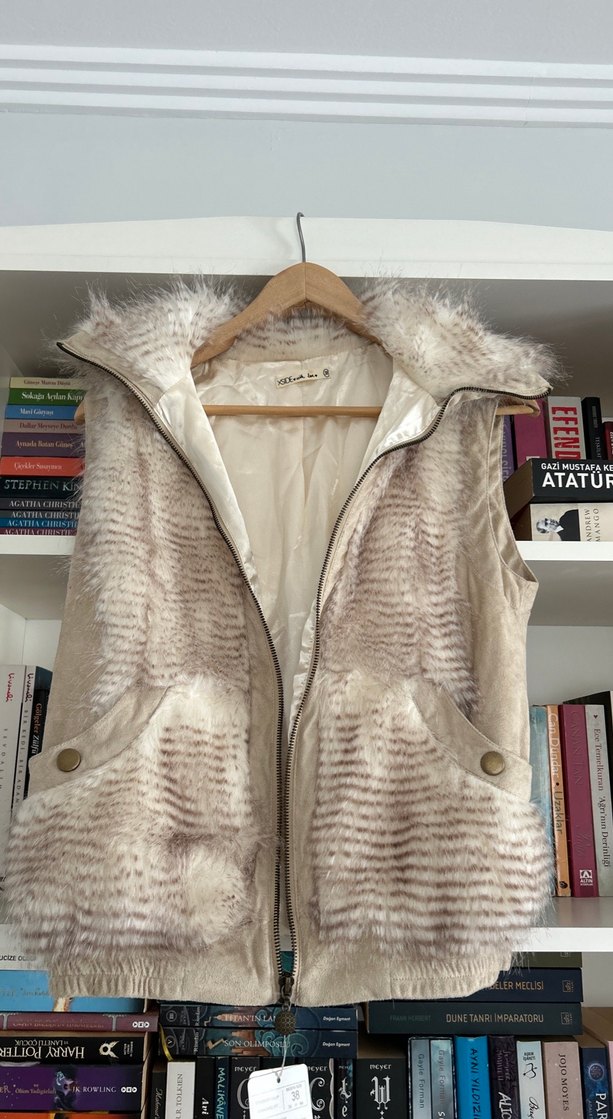 Yüksek yaka ve kürk detaylı, suni kumaştan yapılmış bej renkli, bohem tarzda, midi uzunlukta ve kolsuz, vücuda oturan yelek. Rahat ve şık görünüm için uygundur.