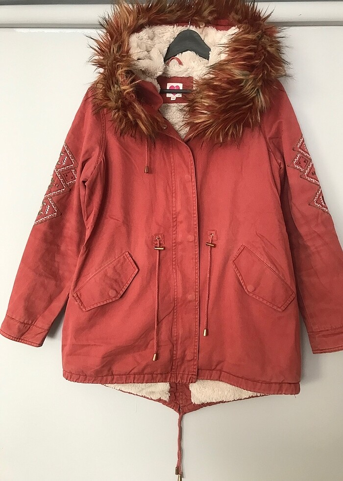 İyi durumda yırtık sökük vs. yok. Kol kısmında renkte solmalar oldu. Kiremit renktedir. Ürün arka boy:80 / ön boy:62 / kol 59 cmdir