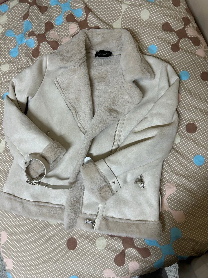 Bej süet kadın ceket, kürk detaylı yakası, manşetleri ve etek ucu ile dikkat çeker. Oturmalı kesimi, kesik yaka ve askılı kollarıyla rahat ve şık bir sokak stili sunar. Midi boyda, desensiz ve günlük kullanıma uygundur.