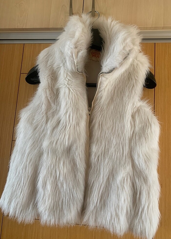 Suni yelek ,rengi beyaz olduğundan üründe bir bir kirlenme vardır ,38 beden uyumludur ,içinde astarı vardır ,astar kısmında biraz sokulme var içte kaldigi için belli olmuyor dikilebilir ,çok sık ve rahat bir yelektir .eni koldan :47 ,boy :54 cm dir .Alan kişi iyi günlerde giyinsin