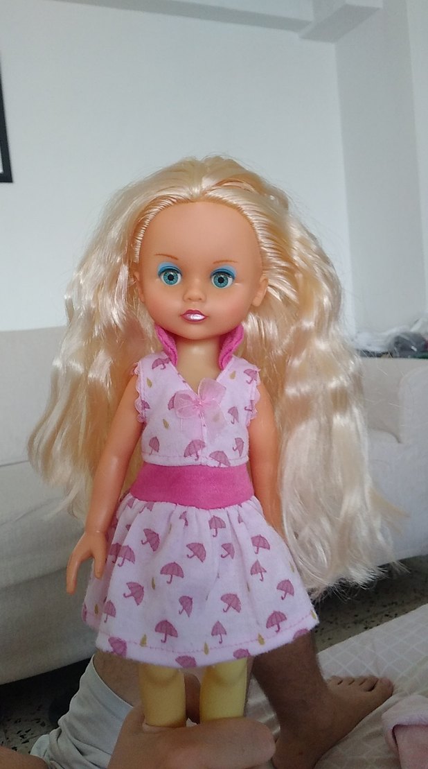 Uzun sarı saçlı bebek, şemsiye desenli pastel pembe elbise giymektedir. Mavi gözlü ve sevimli ifadeye sahiptir.