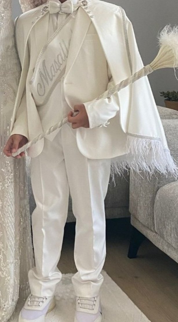 Diger markasının beyaz erkek çocuk takımı, ipeksi kumaş, nakışlı detaylar ve kürk süslemeler içerir. Modern klasik tarzda, uzun kollu ve kesim tam takım isteyene ayrıntı yazabilirim