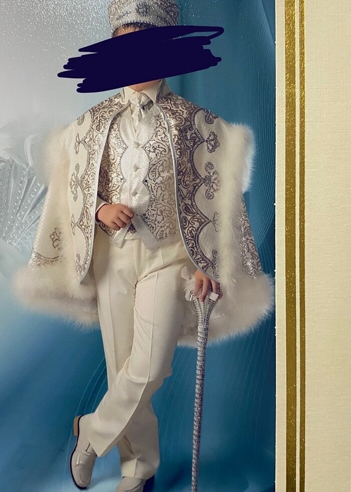 Pelerin, şapka, eldiven, asa, kravat,kemer, yelek, gömlek, pantolon, kılıç mevcut. Kırık beyaz(krem) rengindedir. Fiyatta indirime gidebilirim