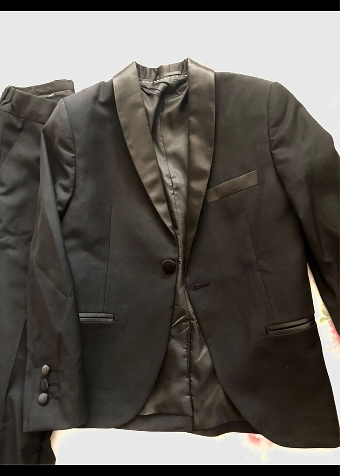 B&G store marka saten şal yakalı 8 yaş smokin takımı,Ata yaka gömlek ,yelek ,papyon ,pantolon,ceket,kol düğmeleri , pelerin ,şapka ve yaka çiçeğinden oluşmaktadır.Çok kaliteli bir takımdır.Oğlum zayıf ve minyon olduğu için 10 yaşında giymişti .Aynı takımın baba için olanıda sayfamda mevcuttur.