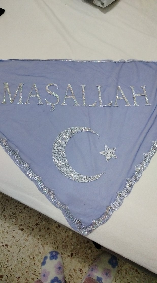 Mavi renkli, payet işlemeli 'MAŞALLAH' yazısı ve ay-yıldız figürüyle bohem tarzı yansıtıyor.