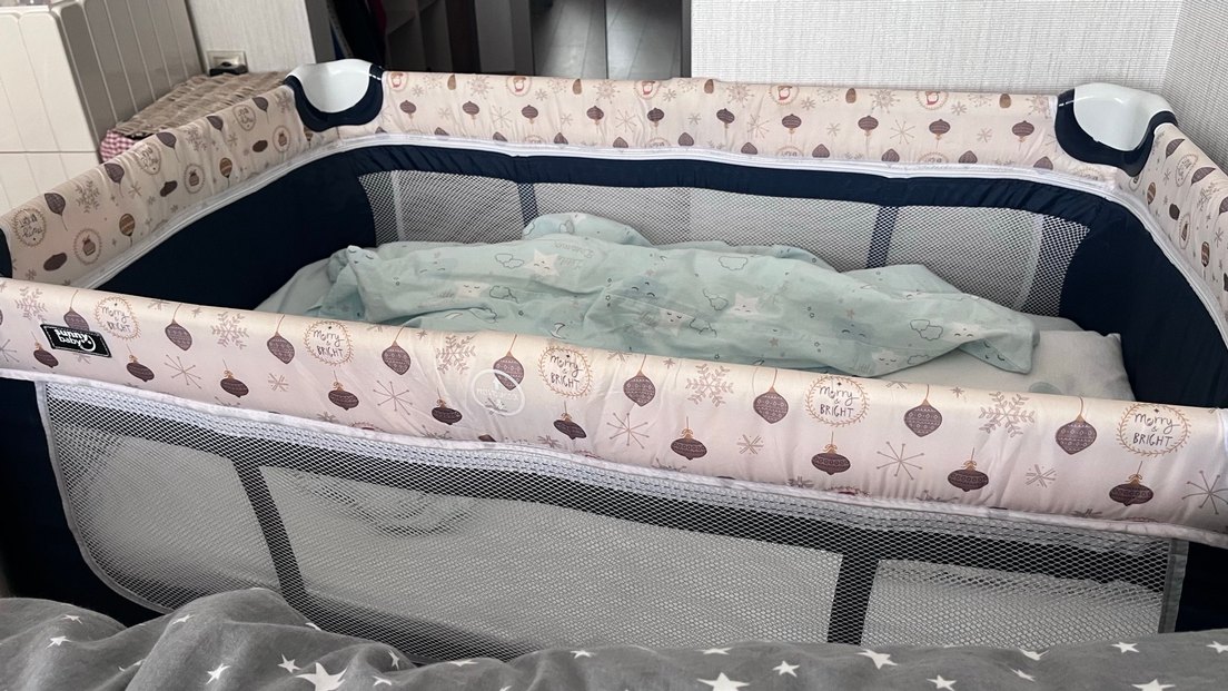 Yumuşak kumaş ve hava alabilen file yanlara sahip gri oyun parkı yatak. Çocuklar için rahat ve desenli tasarım.