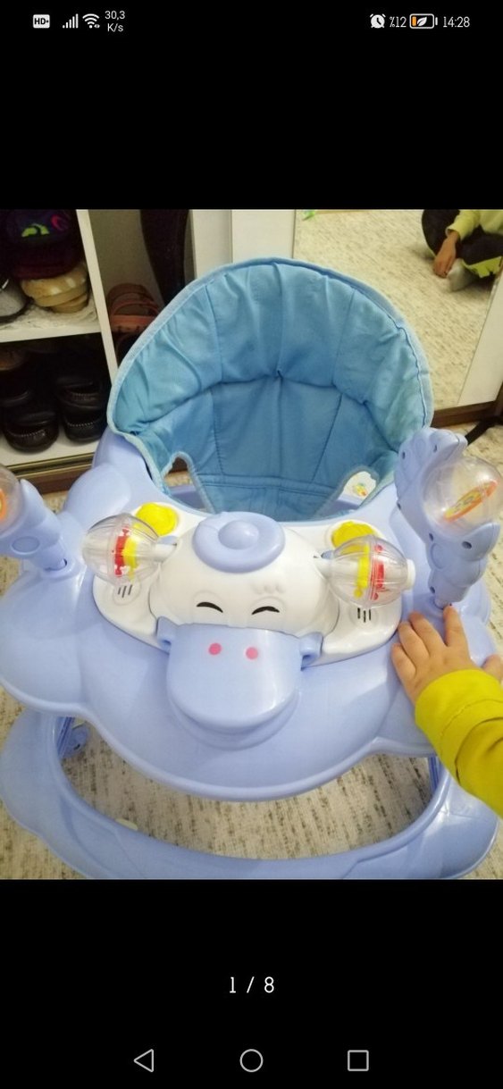 Yumuşak dolgulu oturağı ve ön panelde ışıklı oyuncak ördek tasarımı olan pastel mavi bebek yürüteci. Eğlenceli oyuncaklar içerir. Temiz sağlam iyi durumda