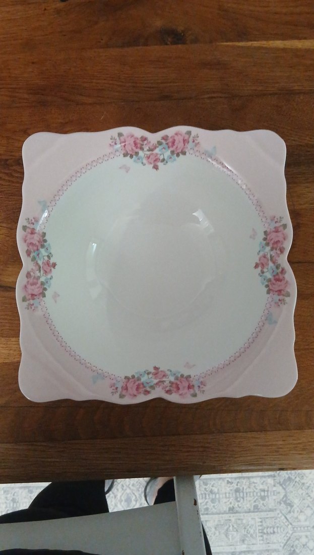Yumuşak pembe ve yeşil tonlarda pastel çiçek desenleriyle çevrili beyaz kare tabak. ️