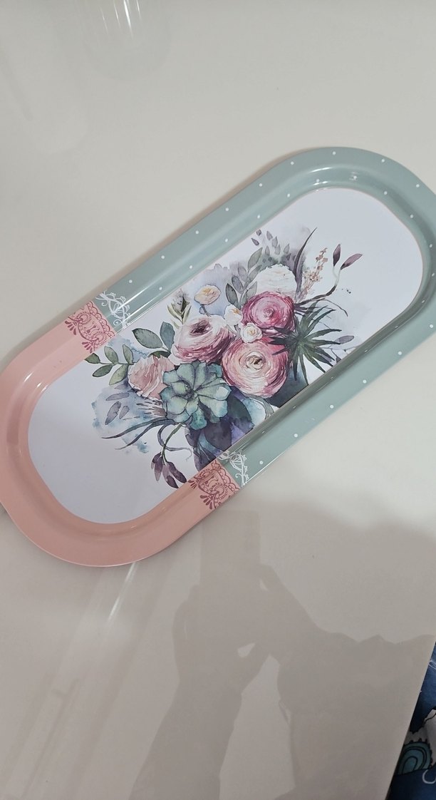 Kahve sunumuna uygun metal tepsi. 2 kişilik kahve sunumları için yeterli boy. Hiçbir defosu yoktur ve temizdir. Çok az kullanıldı