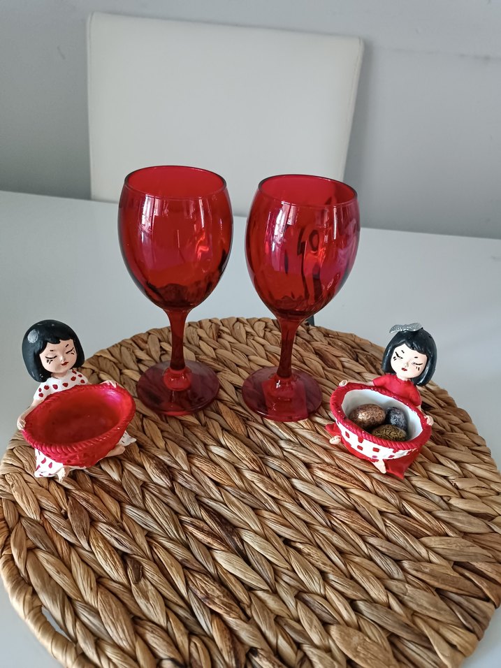 Koyu kırmızı iki kadeh, hasır bir altlık üzerinde iki dekoratif figürle birlikte. Figürlerden biri küçük bir kase içinde ceviz tutuyor. kahve fincanlarida var sayfamda