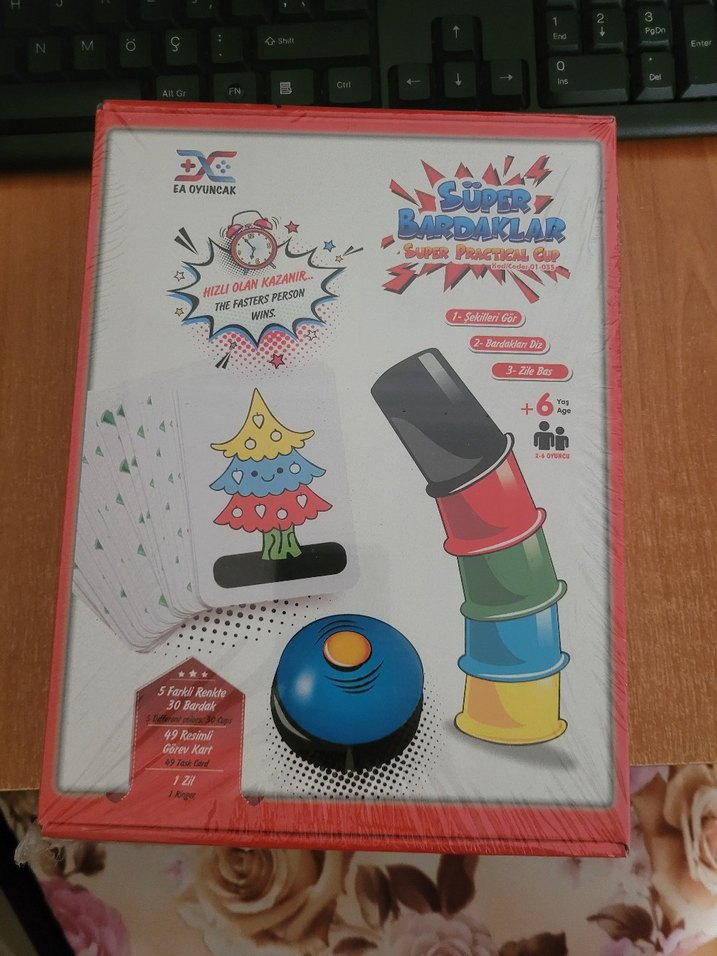 6 yaş ve üzeri çocuklar için 54 kart ve zili bulunan renkli bardak oyunu. Hız ve koordinasyonu artırır. Sıfır ürün.
