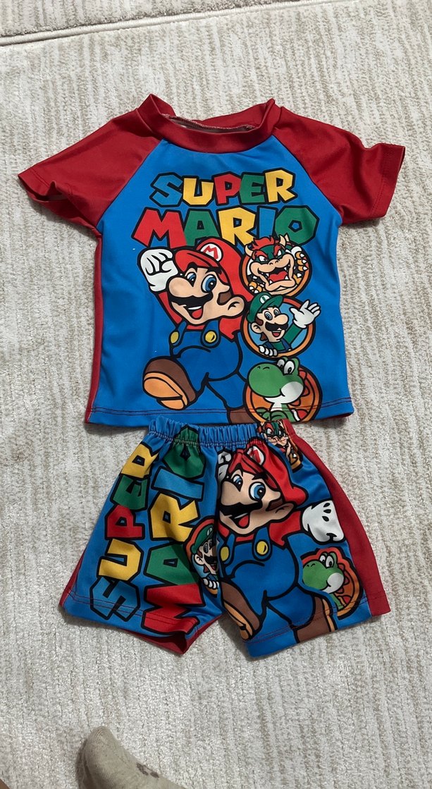 Kısa kollu üst ve şorttan oluşan renkli Super Mario baskılı erkek çocuk mayo takımı. Üst kısmı kırmızı kollu ve mavi gövdeli, Mario karakterleri yer alır. ♂️