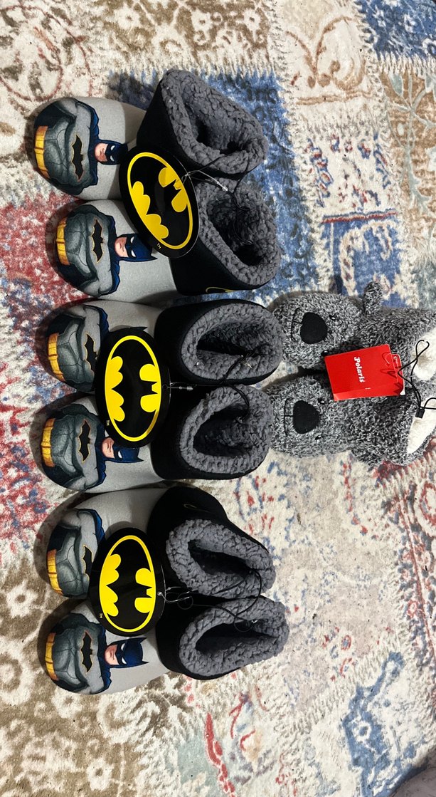 Koyu gri renkli, Batman desenli, cırt cırtlı ve yumuşak iç yüzeyli erkek çocuk terliği. Rock punk havası verir.