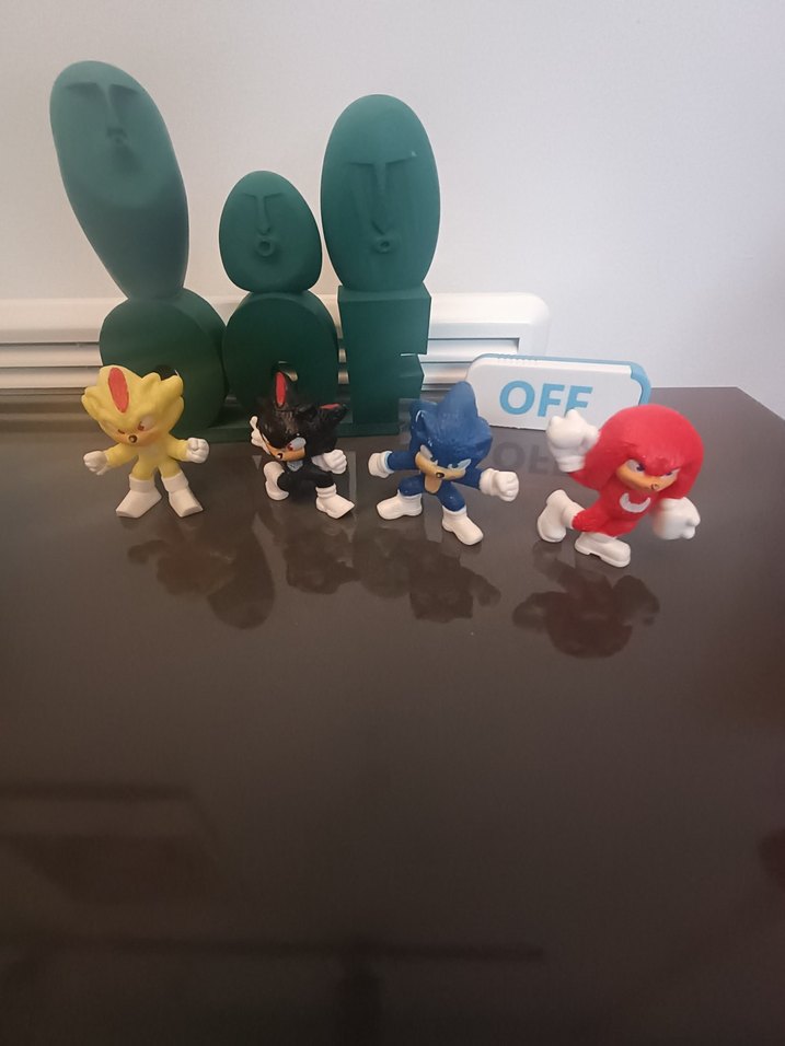 Süper Sonic 4'lü Animasyon Figürleri Seti. Dört farklı renkte animasyon figürlerinden oluşan renkli set, koyu zemin üzerinde ve arka planda dekoratif objelerle sergileniyor.