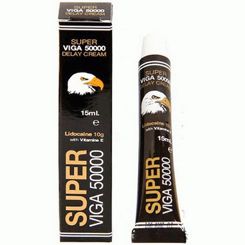 Super Viga 50000 geciktirici krem, 10g lidokain ve E vitamini içerir, 15ml tüpte sunulur. Erkek bakımı için.