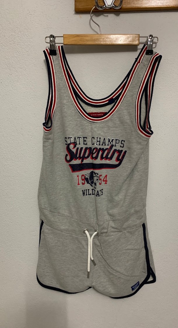 Superdry markalı gri kolsuz mini tulum, baskılı ve kemer detaylıdır. Şeritli kenarları ve straplez yakasıyla spor ve şık bir görünüm sunar.