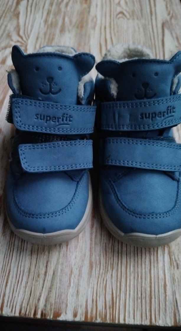 Superfit markalı, mavi ve gri detaylı, kaydırmaz kauçuk tabanlı, cırt cırtlı, işlemeli erkek çocuk botu.