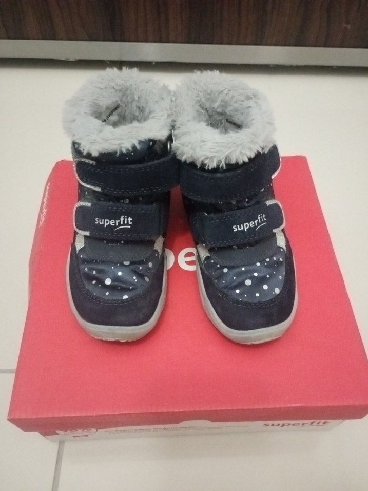 Mavi ve gri baskılı, yumuşak ve sıcak kürklü çocuk botu. Kolay giyime uygun cırt cırt bantlı, Superfit marka. 25 numara sorunsuz goretextir