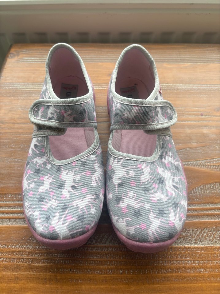 Gri tonlarda, tokalı kayışlı kız çocuk babet ayakkabı. Yumuşak kauçuk tabanlı, ev okul ayakkabısı. Unicorn desenli.