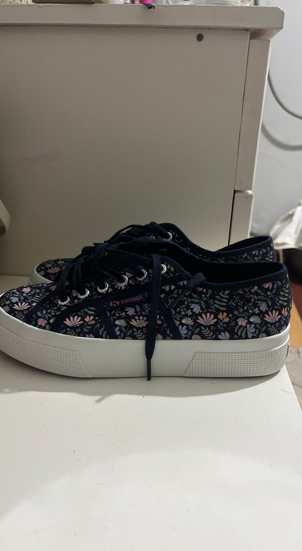 Çiçek desenli, koyu renk tabanlı, platform topuklu ve bağcıklı kadın spor ayakkabısıdır. Kauçuk tabanı dayanıklılık ve konfor sağlar. Hiç giyilmedi.