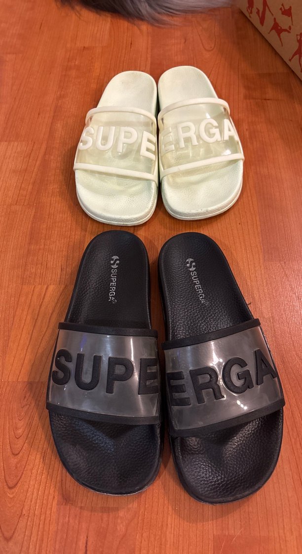 Superga kadın terlikler, Velcro bant ve baskılı logo ile dayanıklı kauçuk malzemeden, canlı yeşil ve siyah renklerde, spor şıklık için uygundur.ikili son fiyat az giyildi