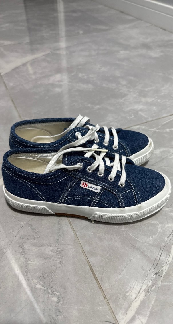 Lacivert denim kumaştan, beyaz bağcıklı. Günlük kullanıma uygun rahat ve şık bir model. Bir kere denemek için giyildi görüldüğü gibi temiz. 33 numara ve orijinal üründür.