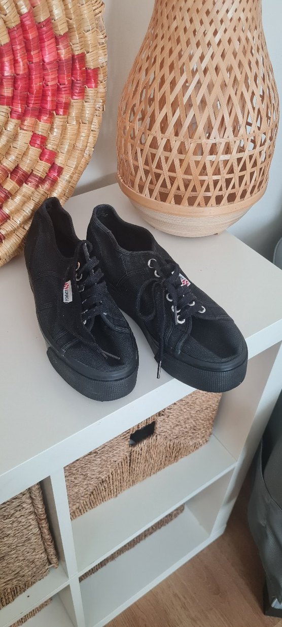 Superga siyah kauçuk platform topuklu kadın spor ayakkabısı, zahmetsiz şıklık ve trend sokak stili için uygun, günlük kullanıma ideal. Birkac kere giyildi o kadar.