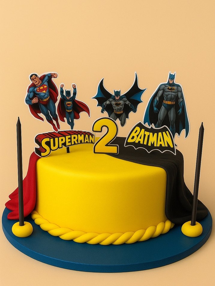 Canlı renklerde Süperman ve Batman figürleriyle süslenmiş, sarı tabanlı doğum günü pastası. Kırmızı ve siyah detaylar ve 2 rakamı bulunur.