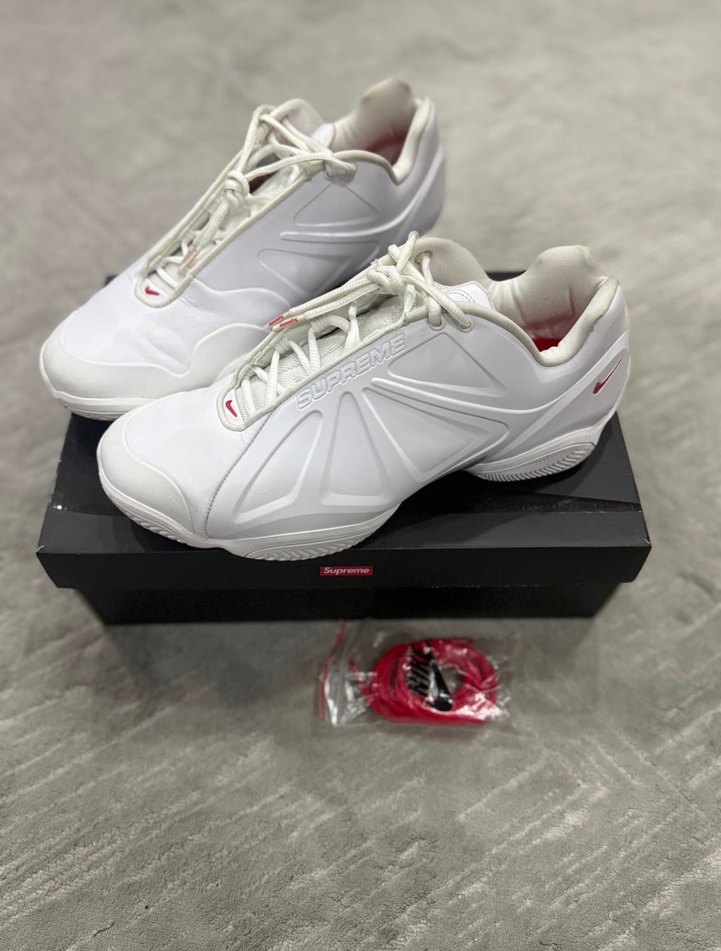 Supreme markalı, beyaz kauçuk malzemeden yapılmış, elastik bağcıklı erkek spor ayakkabısı. Spor ve sokak stili için uygun, sade ve şık tasarım.