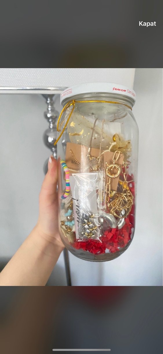 Çok şık ve karışık tarzda takılar bulunduruyor kolye yüzük bilezik bileklik kolye hepsinden karışık bulunmakta memnun kalacağınız hoş takılar 30 a yakın var hepsi sıfıda yakın bazıları sıfır paketinde ve süpriz hediyeler de ekledim içine sıfır mum anahtarlıklar ve sıfır takma tırnak içerisinde bulunmakta. bu fiyata memnun kalacağınız maksimum kavanoz denebilir
