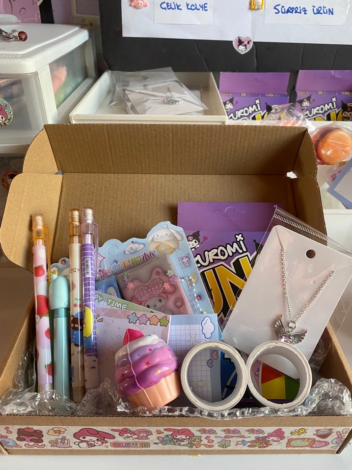 Pastel pembe renklerde kalemler, süsleme bantları, cupcake şeklinde bir kalemtıraş ve gümüş renkli melek kanadı kolye içeren okul aktivite seti. ️