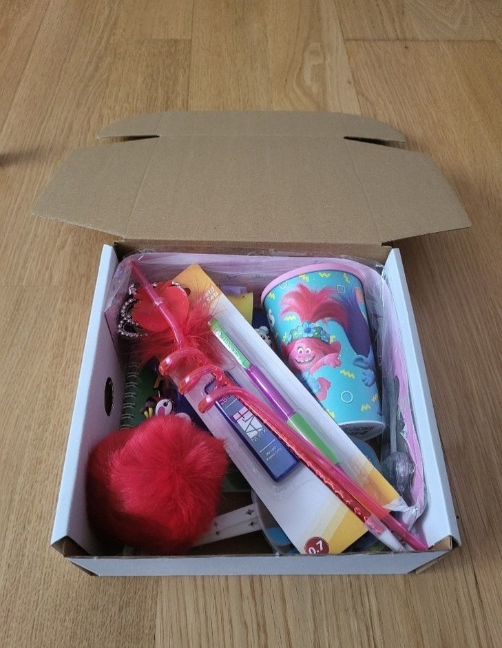 Renkli okul malzemelerinden oluşan set, sürpriz hediyeler, tüylü kalem, desenli bardak ve çeşitli kırtasiye ürünleri içerir. ️