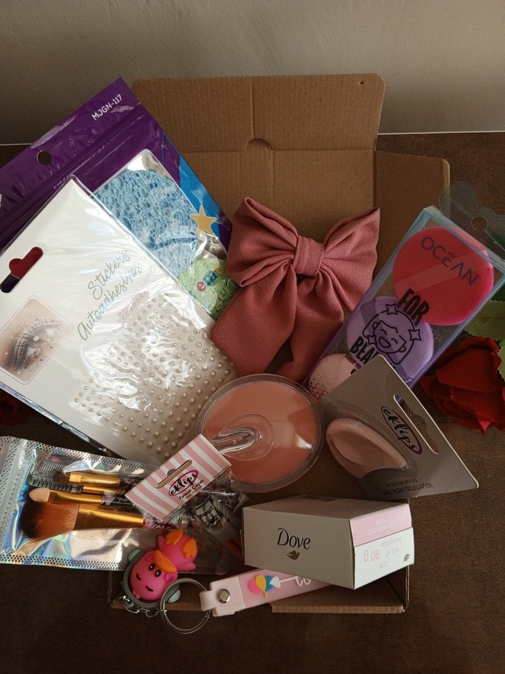 Hediyelik pastel pembe tonlarında olan ve kurdele toka, saç masaj tarağı, Dove sabun, pudra süngeri, yüz temizleme süngeri, makyaj fırçaları, anahtarlık, tırnak makası, metak törpü içeren set.