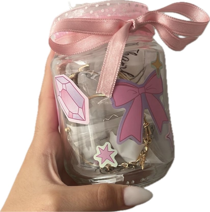 Pembe pastel renkte, fiyonk ve yıldız desenli çıkartmalarla süslenmiş kavanoz. Üstünde pembe saten fiyonk bulunur ve içinde küçük aksesuarlar yer alır.