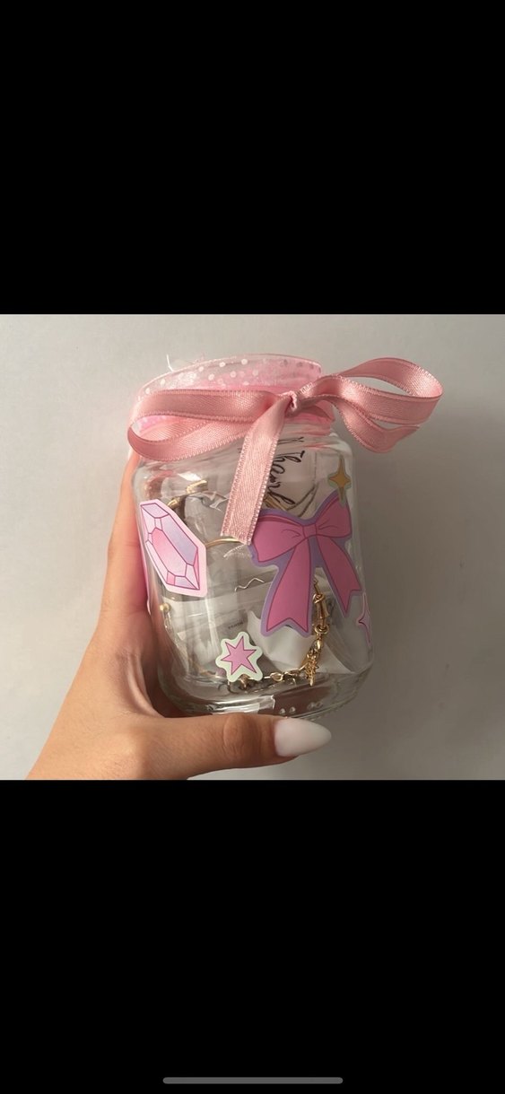 Pastel pembe renkte, dekoratif çıkartmalar ve saten kurdele fiyonk ile süslenmiş makyaj düzenleyici kavanoz.
