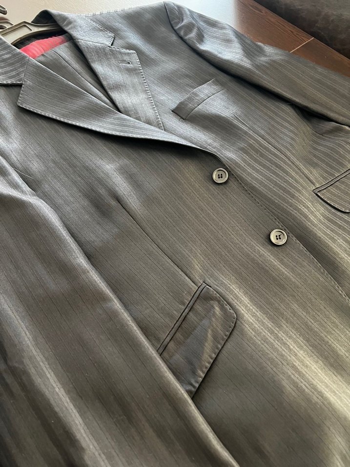 Sadece bir kez giyildi,siyah çizgili takım.Renk simsiyah fotoğraflarda açık duruyor.Ürün defosuz ve tertemiz takımdır.