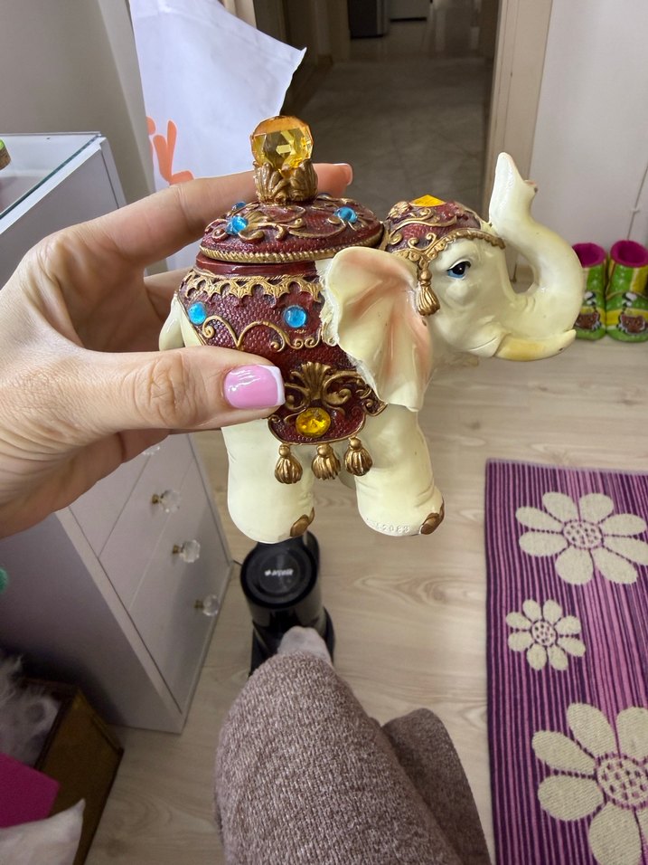 Bu beyaz fil biblosu, renkli taşlar ve altın detaylarla süslenmiş olup, mekana canlılık katar. Ürün sıfırdır. İçine takı tarzı küçük şeylerde konur ya da dekor amaçlı . Şu an bu tarz ürünlerin güncel fiyatı 1.500 den başlıyor