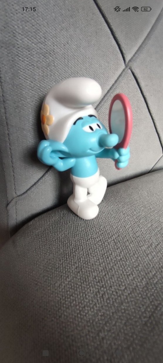 Renkli mavi Şirin aksiyon figürü, pembe ayna tutuyor. Klasik beyaz şapka ve pantolonlu oyuncak.