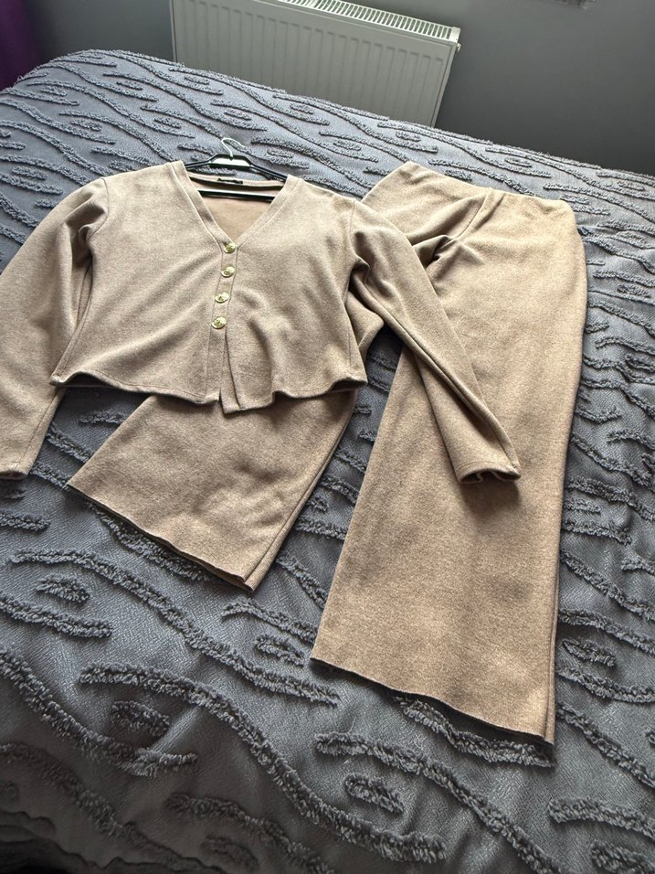 Kadınlar için süt kahve renkte, uzun kollu ve triko kumaştan yapılmış, bol kesim uzun takım. V yakalı üst ve uzun etekle rahat ve şık bir görünüm sunar.