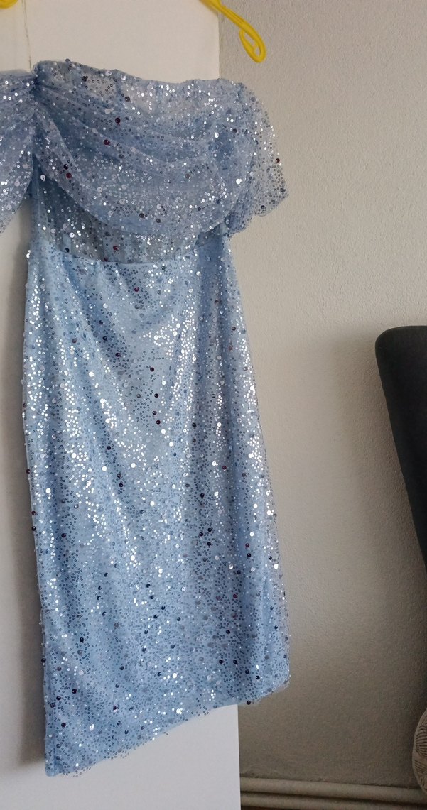 süt mavi renkli, straplez ve simli detaylara sahip, diz boyu ve vücuda oturan abiye elbisedir. Kollu olmayan tasarımıyla gece partileri için uygundur. ✨