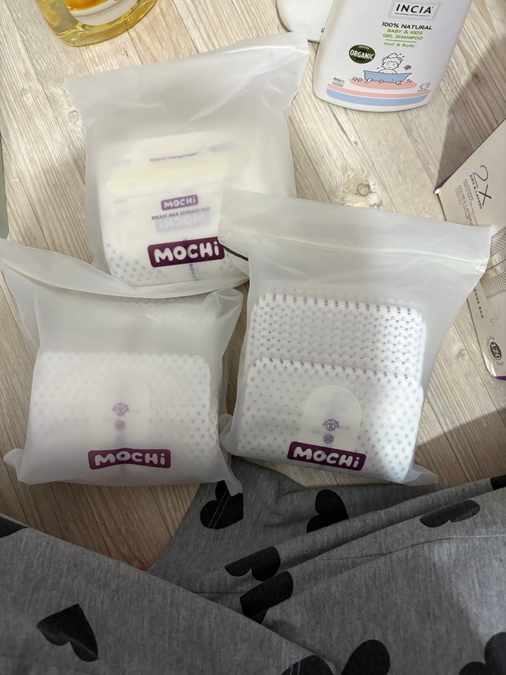MOCHI ve INCIA etiketli beyaz ve gri renklerde süt saklama poşetleri ve kapları, hijyenik süt saklama için uygun. 64 adet