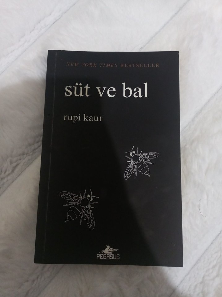 Rupi Kaur'un New York Times bestseller şiir kitabı "Süt ve Bal", siyah kapak ve arı çizimleri içerir.
