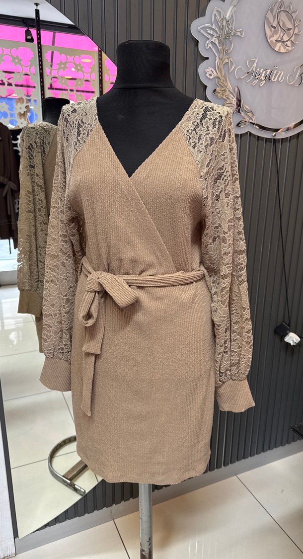 Sütlü kahve renkli triko mini elbise, V yaka ve dantel uzun kollara sahip. Belde kuşaklı, bol kesim ve günlük bohem tarz için uygun.