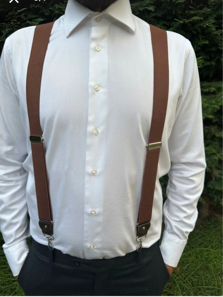 sutlu kahve metal klipsli erkek pantolon askısı, klasik ve trend sokak stili için ayarlanabilir bantlara sahip.Kullanılmadı