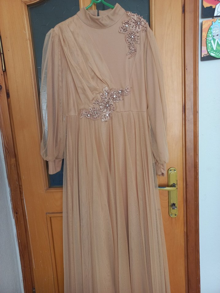 Çok tatlı bir sütlü Kahve Rengide bel ve tel omuzda taş detaylı tül tesettür abiye