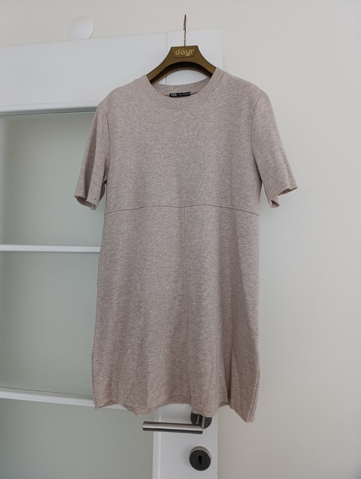 kısa kollu, yuvarlak yaka, bol kesim rahat elbise. Desensiz, gündelik şıklık için uygundur.
