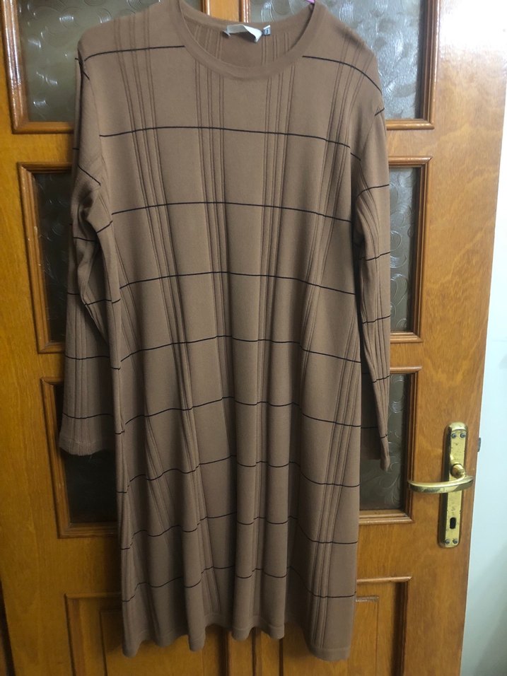 Sütlü kahve, uzun kollu, yuvarlak yakalı ve pileli detaylara sahip bol kesim uzun triko tunik takım. Günlük kullanıma uygundur. Merserizedir. Tunik iki kol arası 58 cm, boyu 94 cm’dir. Pantolonu 102 cm’dir. Gülsüm elkatroushi marka