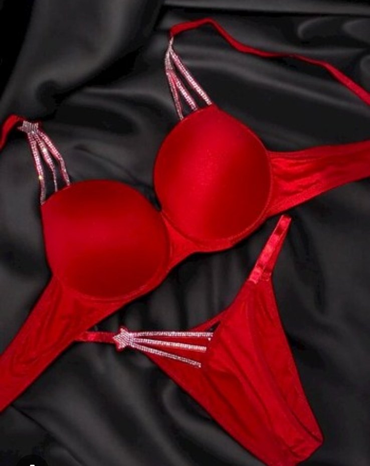 Kırmızı parlak kumaştan yapılan, gotik tarzda, normal uzunlukta sütyen. Parlak askıları ile göz alıcı bir görünüm sunar. Yıldız taş detaylı sütyen takımı #sütyen #sütyentakımı