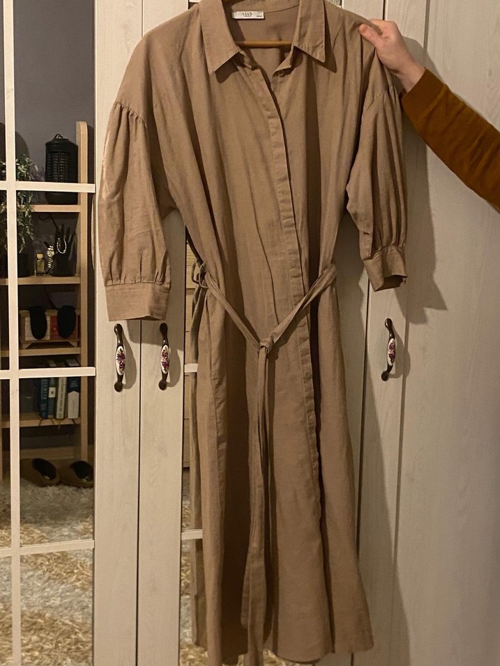 Bej renkte uzun, bol kesim, askılı kollu, klasik yakalı ve belden bağlamalı kadın bohem tarzı elbise. Desensiz ve Parisli esintili.